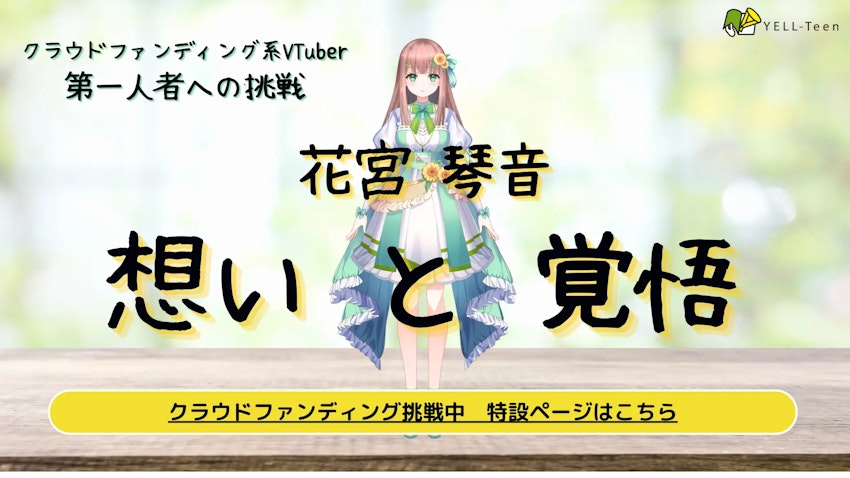 株式会社YELL-Teen(東京都渋谷区代官山町、代表取締役:相原 一斗 以下、YELL-Teen)は、クラウドファンディング事業およびVTuber事業を展開しております。”クラウドファンディング系VTuberの第一人者としての挑戦”の第一弾として、クラウドファンディングプロジェクト『クラウドファンディング第一人者への挑戦!「花宮 琴音」応援プロジェクト』を2024年8月1日より開始いたします。