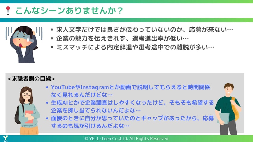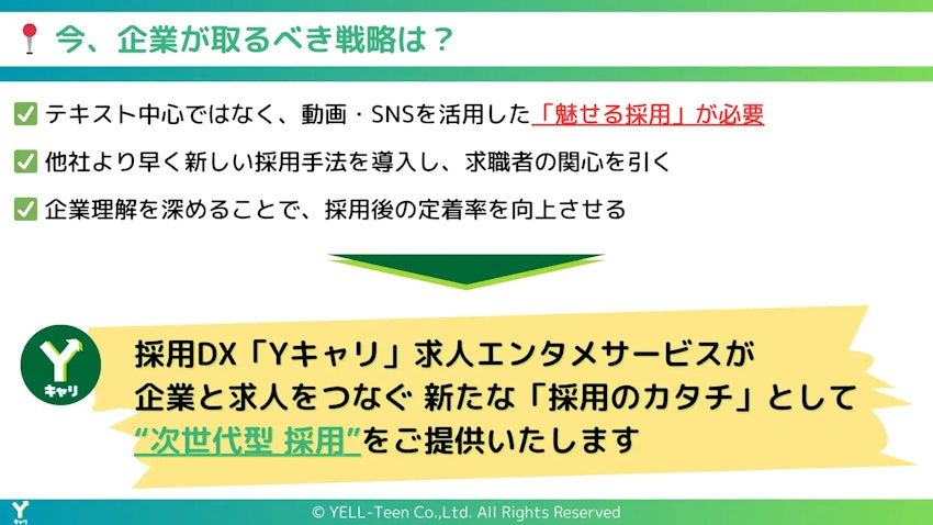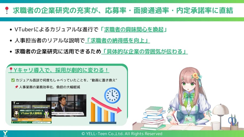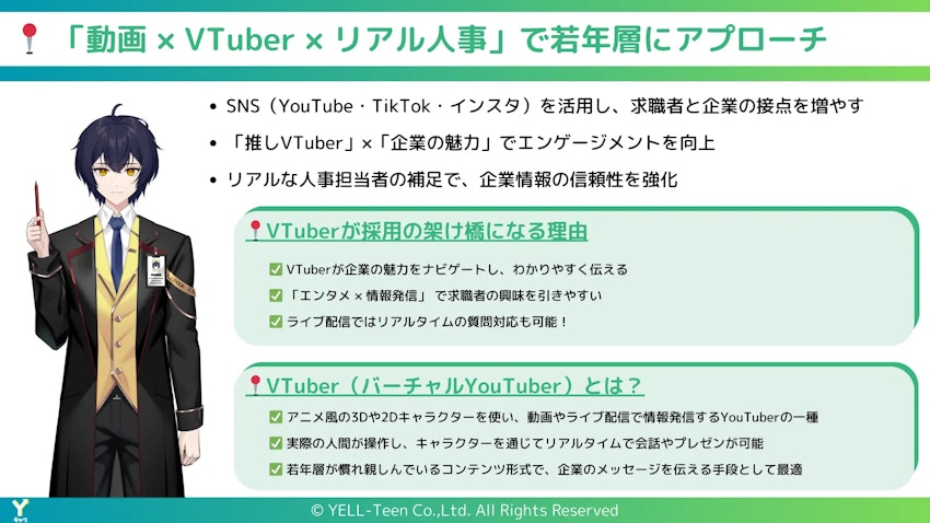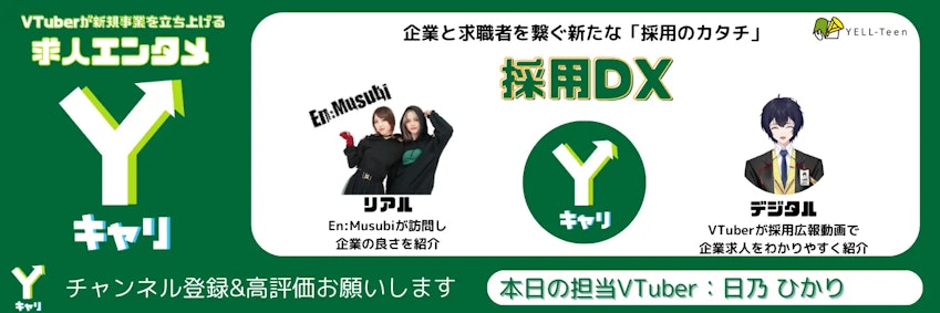 株式会社YELL-Teen(本社:東京都渋谷区代官山町、代表取締役:相原 一斗 以下、当社)は、VTuberを活用した新しい採用支援サービス「Yキャリ」の提供を開始したことを発表いたします。「Yキャリ」は、企業の求人情報や魅力をVTuberが紹介する、エンタメ要素を取り入れた採用広報動画サービスです。このサービスにより、求職者に新しい体験を提供し、新時代の採用DXとして従来の求人情報の伝達方法を革新します。