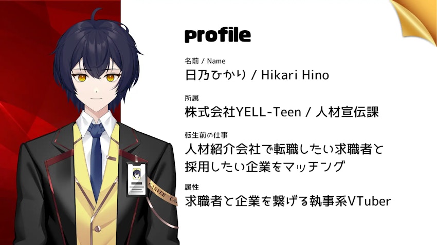 2025年3月、株式会社YELL-TeenがリリースしたYキャリと同時に生まれた新人VTuber 日乃ひかり。求職者と企業を繋げる執事系VTuberとして、Yキャリの事業拡大のミッションを担う。