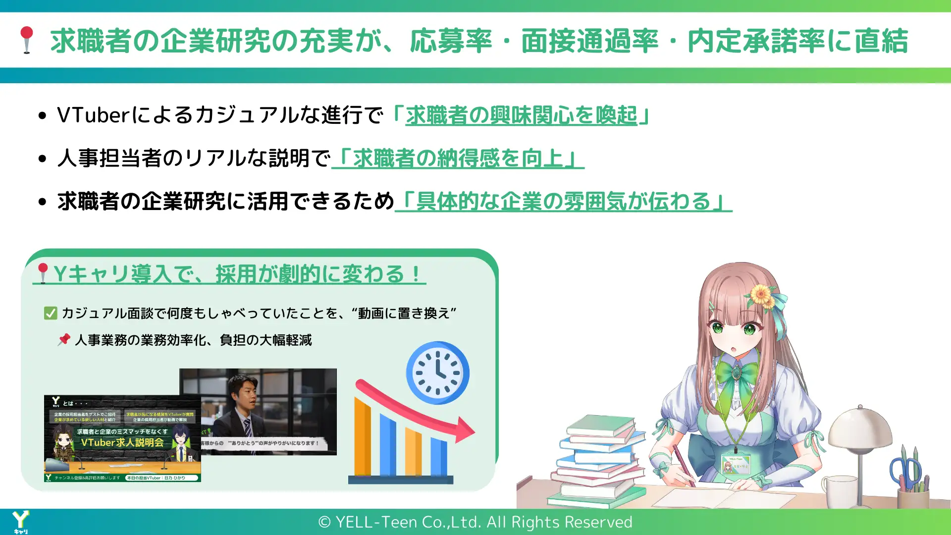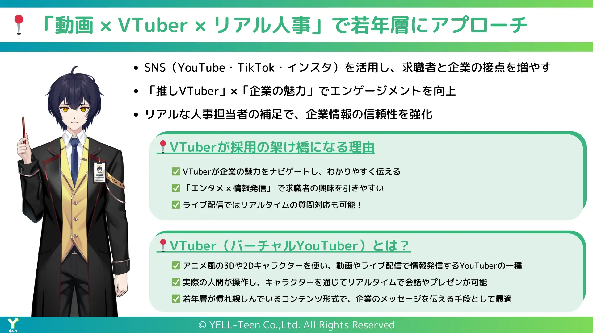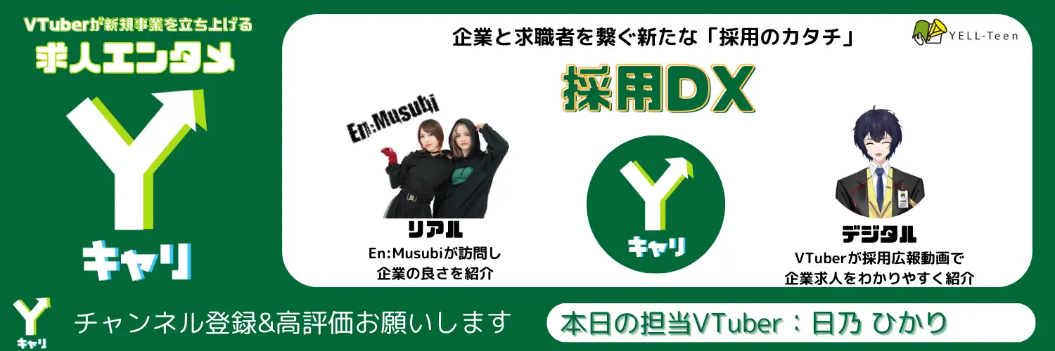 株式会社YELL-Teen(本社:東京都渋谷区代官山町、代表取締役:相原 一斗 以下、当社)は、VTuberを活用した新しい採用支援サービス「Yキャリ」の提供を開始したことを発表いたします。「Yキャリ」は、企業の求人情報や魅力をVTuberが紹介する、エンタメ要素を取り入れた採用広報動画サービスです。このサービスにより、求職者に新しい体験を提供し、新時代の採用DXとして従来の求人情報の伝達方法を革新します。